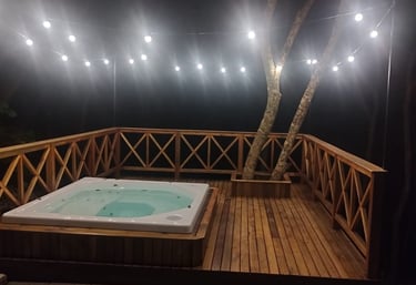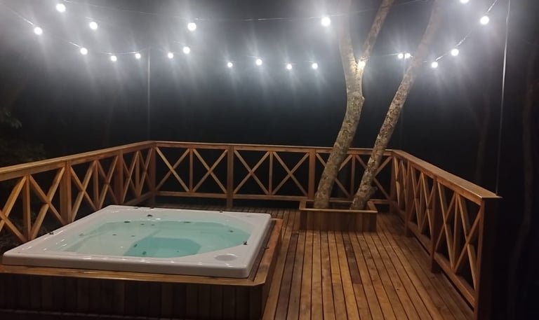 Desfrute da jacuzzi externa para 6 pessoas, perfeita para relaxar após o dia no Show Rural.