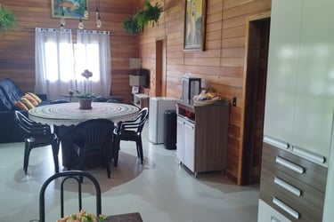 A casa oferece ar-condicionado, cozinha completa, churrasqueira, jacuzzi para 6 pessoas, internet wi-fi e garagem para 4 carros.