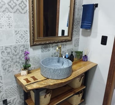 A decoração rústica adiciona um toque acolhedor e charmoso ao ambiente.